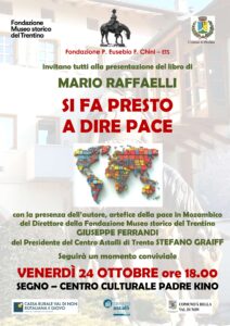 Venerdì 24 ottobre 2025 alle ore 18.00 a Segno presso il Centro Culturale Padre Kino ci sarà la presentazione del libro di Mario Raffaelli “Si fa presto a dire pace”. L’evento è promosso dalla Fondazione P. Eusebio F. Chini – ETS con la collaborazione della Fondazione Museo storico del Trentino e il Comune di Predaia. Si svolge in un luogo particolare, presso il Centro Culturale Padre Kino, uomo di pace e costruttore di ponti; ancora oggi il suo nome e la sua opera sono presi ad esempio nei difficili territori oltreoceano in cui ha operato, ora attraversati da un terribile muro di confine tra USA e Messico.